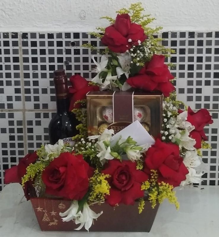 Arranjo Rosas Astromelias Ferrero Rocher e Vinho