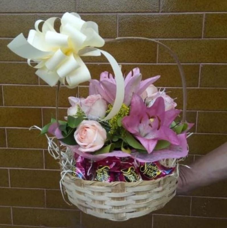 Cesta com lírio, rosas e sonho de valsa